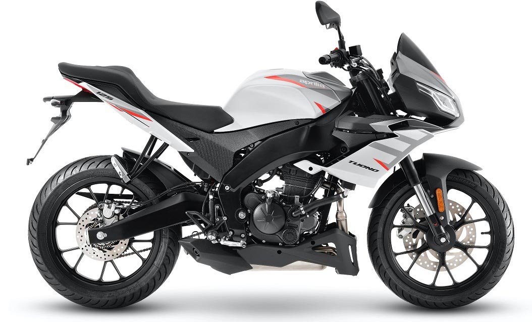De Aprilia Tuono 125 is beschikbaar in drie kleurstellingsvarianten: Aprilia Black, gekenmerkt door de combinatie van rode en zwarte kleuren; Lightning White met intrigerende matte witte en grijze kleuren, en de meer sobere Arrow Gray-variant met glanzende grijze en zwarte tinten.