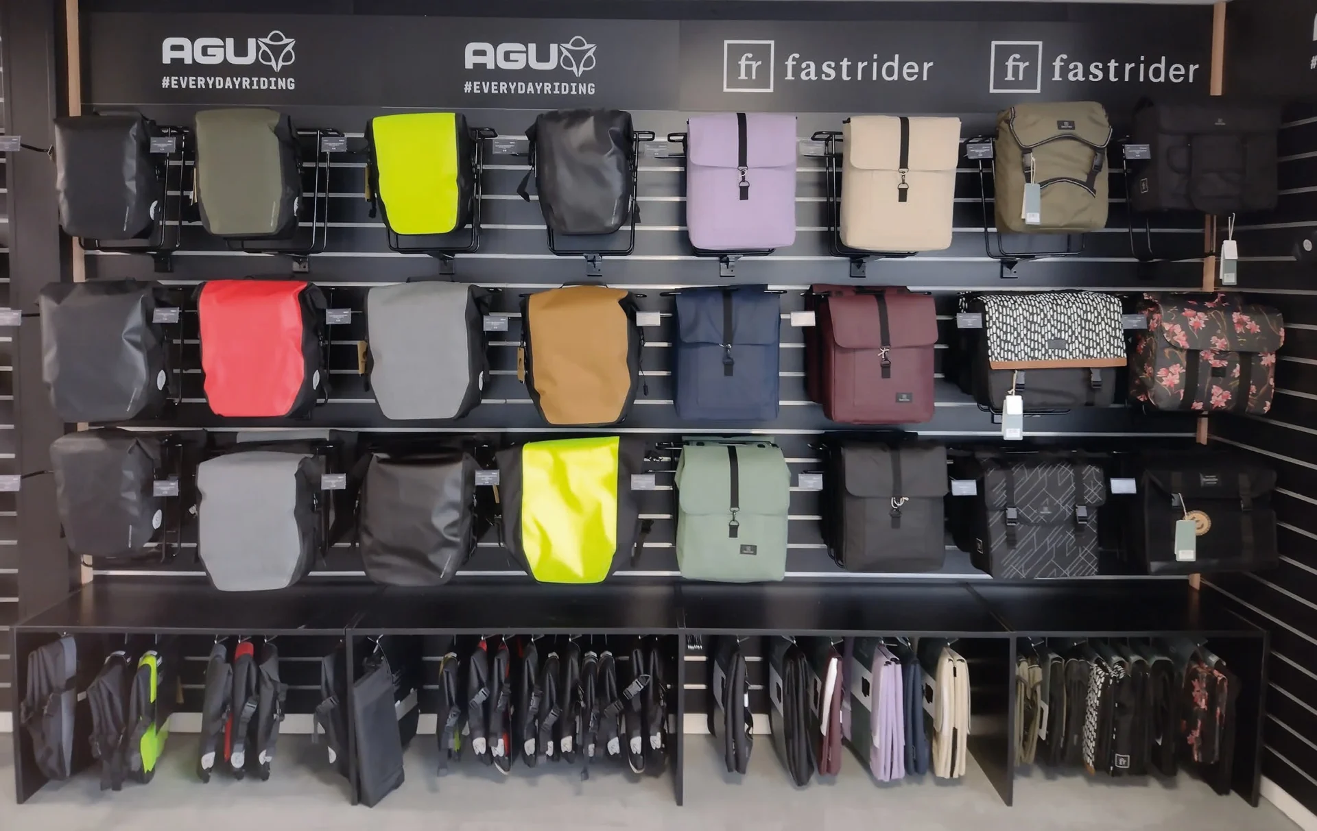 De waterdichte Convoy-lijn is ideaal voor wie dagelijks op de fiets stapt voor woon- werkverkeer. Voor de commuter én voor wie op fietsvakantie gaat, is de Shelter perfect en voor avontuurlijke fietsers zijn Bikepacking de beste lijn: lichtgewicht en zonder dragers te plaatsen. FastRider biedt een breed assortiment fietstassen, manden en kratten voor dagelijks gebruik. De collectie combineert de robuustheid van klassieke fietstassen met eigentijdse ontwerpen en duurzame materialen. Het Click’nGo-systeem van AGU zorgt ervoor dat tassen eenvoudig op de fiets kunnen worden geplaatst. Handig, snel en veilig.